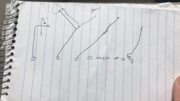 On the third-and-15, the Chiefs lined up the same way they had in the first half. Watkins ran the same route he had previously. Kelce and Hill made it look like they were, too. Only this time, as both guys went into their breaks, and the defense recognized what was coming, things changed—as Kafka illustrated by scribbling in my notebook (below). Kelce, instead of sitting down in a soft spot in the 49er coverage, stutter-stepped and darted across the middle. Hill took two steps inside, as if he were running to the post, then broke outside.