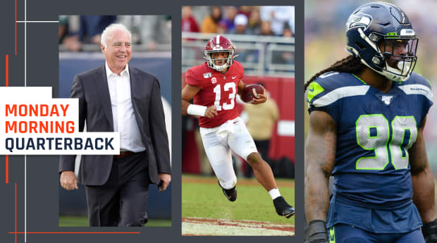• Burrow is clearly the cleanest quarterback. And based on all the Bengals’ actions, I’d expect him to be the pick at No. 1 (which isn’t exactly breaking news). Tagovailoa’s status is more uncertain, and teams are plenty uneasy about his durability (we have more on that lower in the column). Miami’s widely been seen as his landing spot, in part because owner Stephen Ross was at LSU-Alabama to see him play, and went with CEO Tom Garfinkel and GM Chris Grier to Bama’s bowl game, a game Tagovailoa didn’t even play in, to see him. But there’s a flip side to all that due diligence—it didn’t necessarily lead them to the conclusion that Tua’s the right pick. In fact, all the work may have taken them the other way. We’ll find out soon enough.