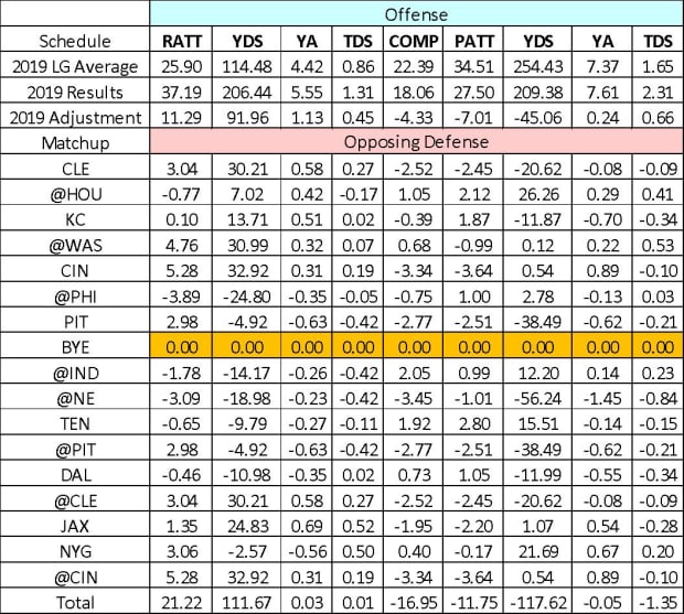 The Ravens have three games (DAL, TEN, and IND) vs. teams that ran the ball at a decent clip in 2019. Their defense has six contests (WAS, KC, PIT X 2, and CIN X 2) against opponents that grade below average in rushing yards.