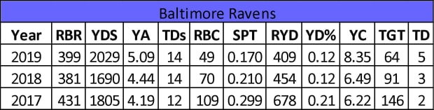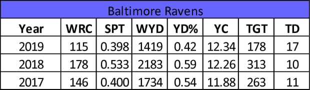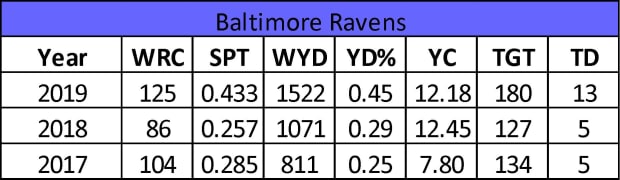 Over the last three seasons, tight ends have been active in the Ravens’ passing game. They had growth in passing yards in back-to-back years and a massive spike in all areas in 2019. Baltimore’s TEs had more catches (125), receiving yards (1,522), and targets (180) than their wide receivers (115/1419/17 on 178 targets).