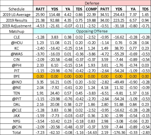 Baltimore has the ninth-best schedule for their pass defense. They’ll have the most considerable edge in four matchups (WAS, IND, and PIT X 2) based on last year's stats. Still, Pittsburgh should be much better passing the ball with Ben Roethlisberger back behind center, and the Colts should get some bump in passing yards with Philip Rivers starting at quarterback. Their two most challenging games defending the pass look to be against Dallas and the Chiefs.